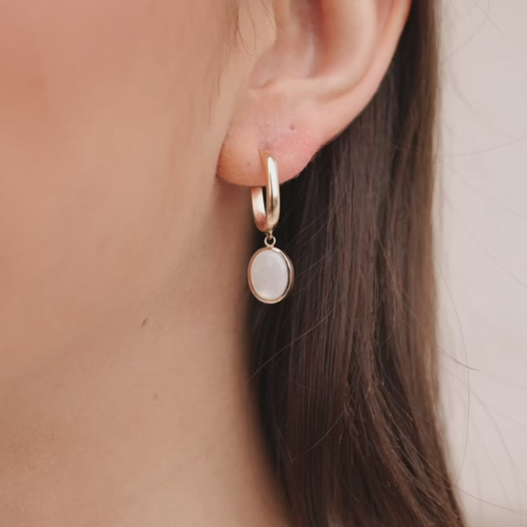 Die Rêve Hoops vereinen ovale Hoops mit einem geheimnisvoll schimmernden Anhänger aus echtem Perlmutt, der in strahlendes Makaro Gold eingefasst ist. Die besondere Oberfläche des natürlichen Perlmutts erzeugt bei Lichteinfall einen irisierenden Glanz, der alle Blicke auf sich zieht. Zusätzlich wird Perlmutt eine wohltuende Wirkung auf Körper und Geist nachgesagt. In Kombination mit dem perfekten Goldton der Hoops, sind die Rêve Hoops die Art von Ohrringen, die noch in deiner Schmucksammlung gefehlt haben.