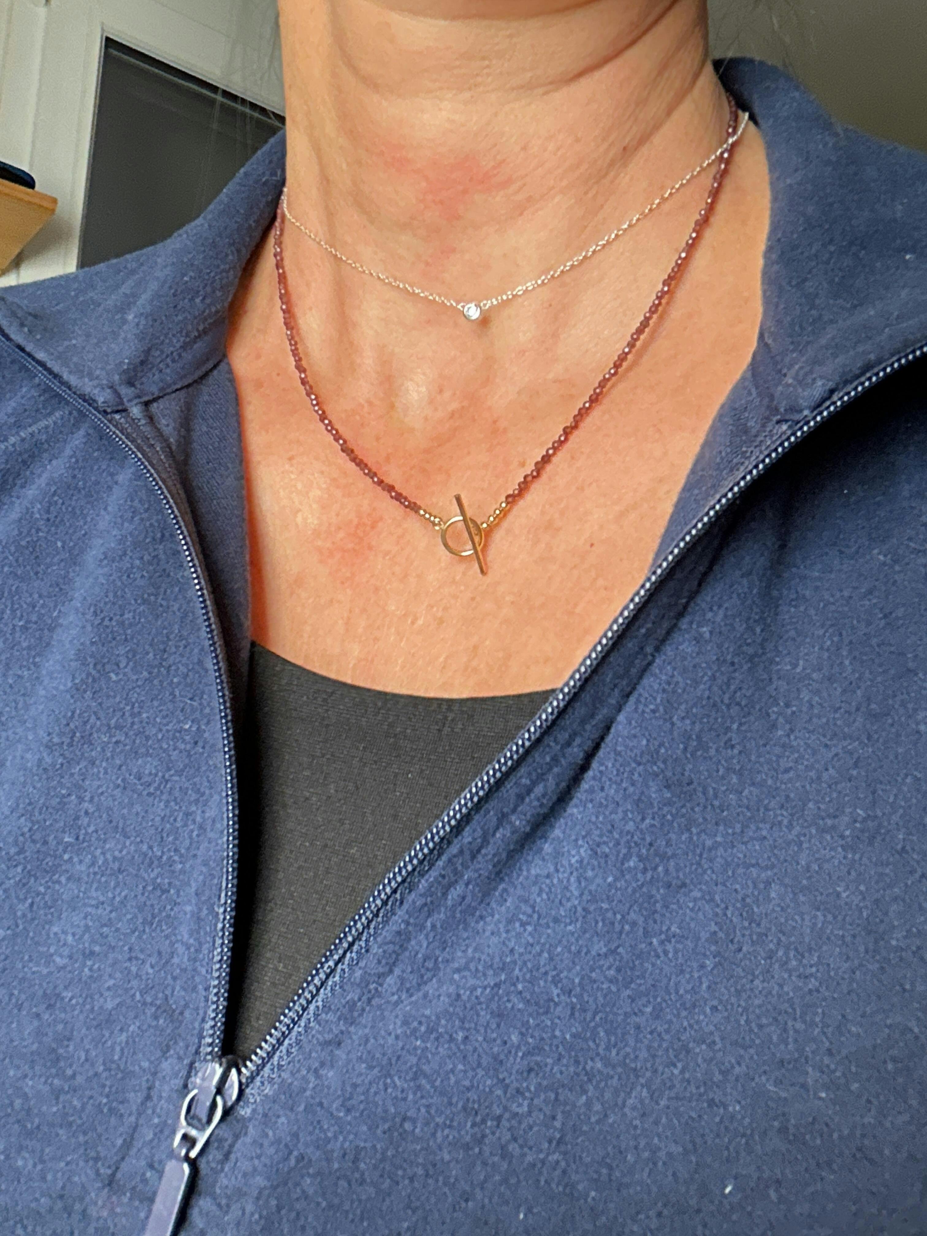 Mit ihrer dunkelroten Farbe zaubert die Talisman Necklace - Garnet einen besonderen Hingucker in jedes deiner Outfits. Ob zu Jeans und T-Shirt oder zum Kleid - ob zu hellen oder dunklen Outfits - diese Kette ist ein Hingucker, der durch die zarte Verarbeitung und das dunkle Rot dennoch nicht allzu sehr ins Auge sticht. Der verwendete, natürliche Edelstein Granat strahlt Wärme und Energie aus und soll Lebenskraft und Freude spenden. Im Zentrum der handgefertigten Kette befindet sich ein handgefertigter Verschluss, der vorne getragen und durch einen Makaro Talisman Anhänger ergänzt werden kann.